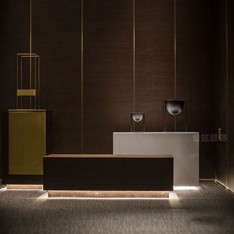大厅装饰墙:直线与弧面的碰撞,方与圆的冲击,简练的元素搭配出了层次鲜明的空间感,每一处都耐人寻味。