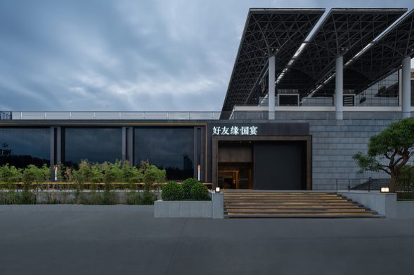 本案位于昆明呈贡区的餐馆装修效果图。餐馆建筑外观大气炳然,设有线性光的台阶引导至…