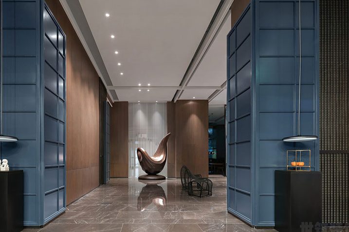 本案位于云南省安宁酒店装修设计效果图,独特的金属造型墙,一条条精致的条板以错位的…