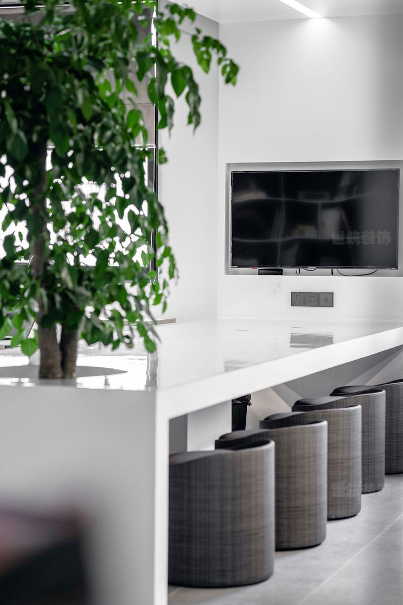 白色的长条桌和白色吊顶打造出的看似独立于办公区之外的小空间,舒适的小吧凳,在这里可以讨论方案,可以自由提出观点,可以在工作累了的时候,享受着窗外照射进来的慵懒阳光,望着那一抹青翠的绿植,给大脑放个短假,更好的投入工作。