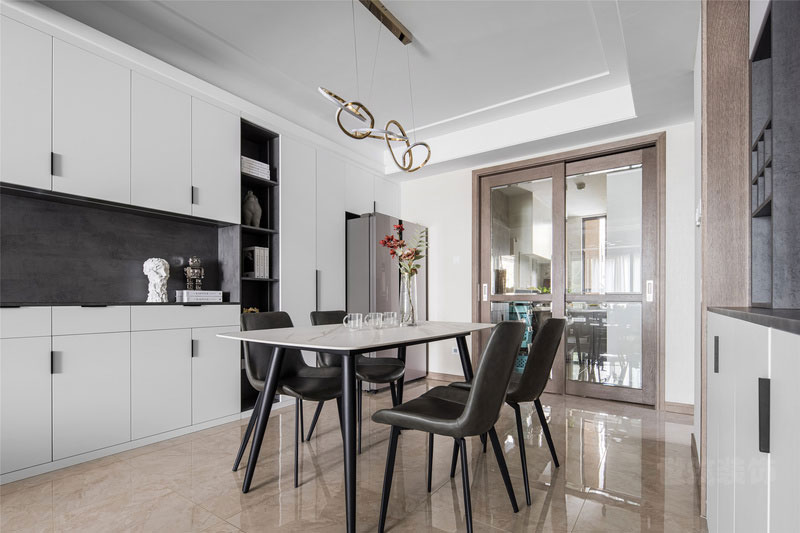 餐边柜在立体层次中的白色基调,以带有独特纹理的艺术水泥灰饰面表现细节。