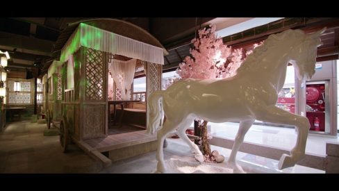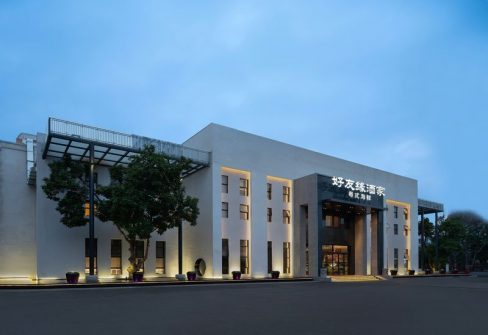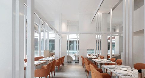 本案位于昆明官渡区酒家餐厅设计效果图,素白的建筑外表,凸出的门厅设计,几何体的建筑外表干净利落,彰显餐厅大气魄…